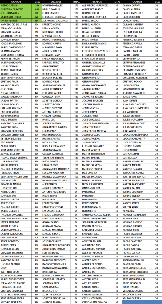 1ero: 300 pts. / 2do. 260 pts. / 3ro. 220 pts. / 4to. 200 pts. / 5to. 180 pts. / 6to. 160 pts. / 7mo. 140 pts. / 8vo. 120 pts. / 9no. 100 pts. / 10mo. 80 pts. / del puesto 11 para abajo 60 pts.