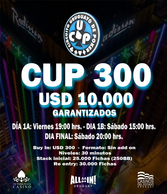 IMPORTANTE: El Evento CUP 300 Main Event 10K GTD, lo podrás jugar el DIA 1A el Viernes 19:00 hrs, y en caso de pasar de día, volver el Sábado 20:00 hrs para la FINAL; o en su defecto jugarlo en 1 día solo, el Sábado desde las 15:00 hrs. a la finalización.
