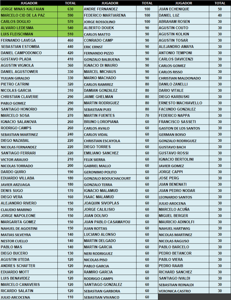 1ero: 150 pts. / 2do. 130 pts. / 3ro. 110 pts. / 4to. 100 pts. / 5to. 90 pts. / 6to. 80 pts. / 7mo. 70 pts. / 8vo. 60 pts. / 9no. 50 pts. / 10mo. 40 pts. / del puesto 11 para abajo 30 pts.