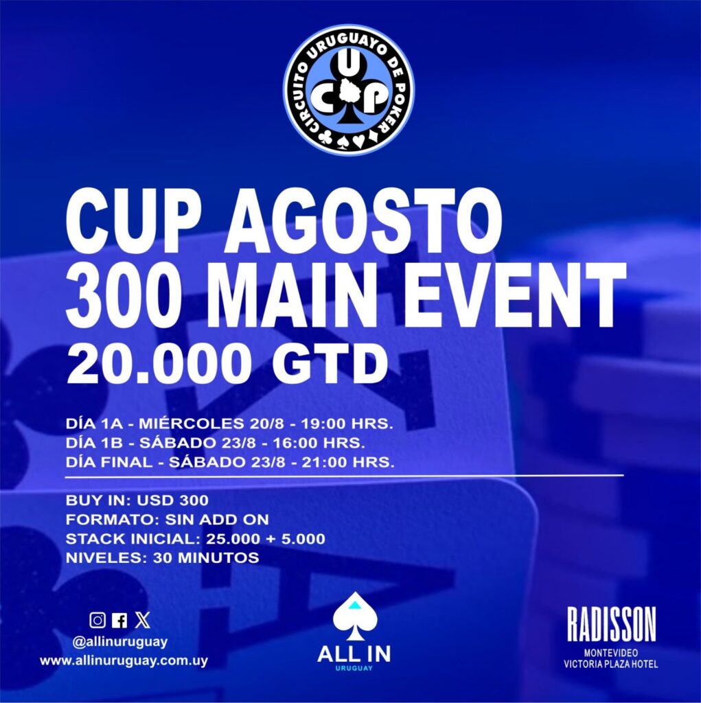 Durante los meses de Abril, Mayo, Junio, Julio, Agosto, Setiembre/Octubre se llevará a cabo el RANKING ALL IN 2025. El cual clasificara todos los meses a los 5 jugadores que hayas cosechado más puntos en todos los eventos regulares en Radisson Montevideo inclusive los eventos CUP. Estos últimos, al igual que la primera semana de cada mes, PUNTUARÁ DOBLE.
