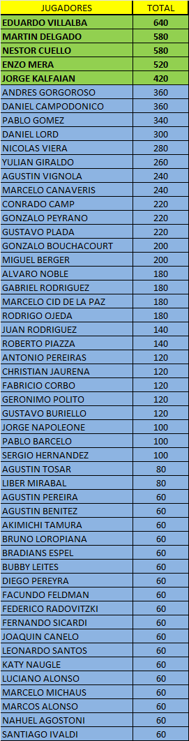 Pero ATENCION, ya que Enzo Mera y Jorge Kalfaian, ya clasificaron por meses anteriores, por lo tanto ellos obtendrían un Stack inicial extra en la GRAN FINAL, y posibilitaría que las posiciones 6 y 7 se metan en la final de Noviembre. En este momento ocupadas por ANDRES GORGOROSO Y DANIEL CAMPODONICO