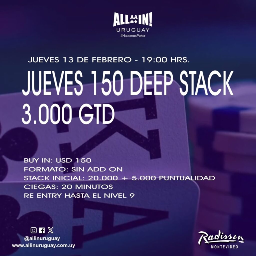 Este Jueves 19:00 hrs en Radisson Montevideo, regresan los eventos semanales a la cuna del poker nacional con la disputa del clásico 150 DEEP STACK 3K GTD, para lo que será una noche divina de poker.