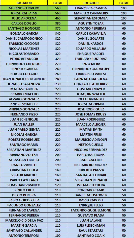 *ANTE IGUALDAD DE PUNTOS, LA VENTAJA SERÁ PARA AQUEL JUGADOR QUE HAYA DISPUTADO MÁS EVENTOS EN EL MES.