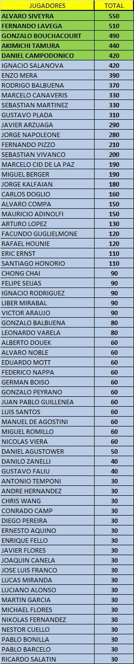 Luego de disputadas 5 Fechas del Ranking Junio ALVARO SILVEYRA, FERNANDO LAVEGA, GONZALO BOUCHACOURT, Y DANIEL CAMPODONICO lideran la tabla y en este momento estarían clasificando a LA GRAN FINAL de Noviembre, gratuita y exclusiva para 30 jugadores, por 1 Auto 0KM.
