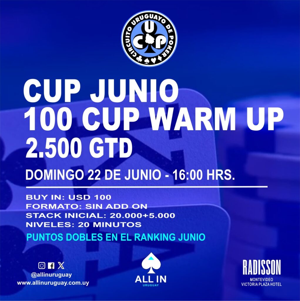 ¡Este Domingo en Radisson Montevideo y con la disputa del CUP 100 WARM UP 2.5K GTD, dára comienzo la esperada SEMANA CUP, que tendrá 5 EVENTOS. Warm up, Super Satélite, Main Event, High Roller, y Last Chance. Todos los eventos PUNTUAN DOBLE, y además obtendrán 200 PUNTOS EXTRAS, fundamentales en la definición del Ranking Junio, aquellos que jueguen todos los eventos de la semana.