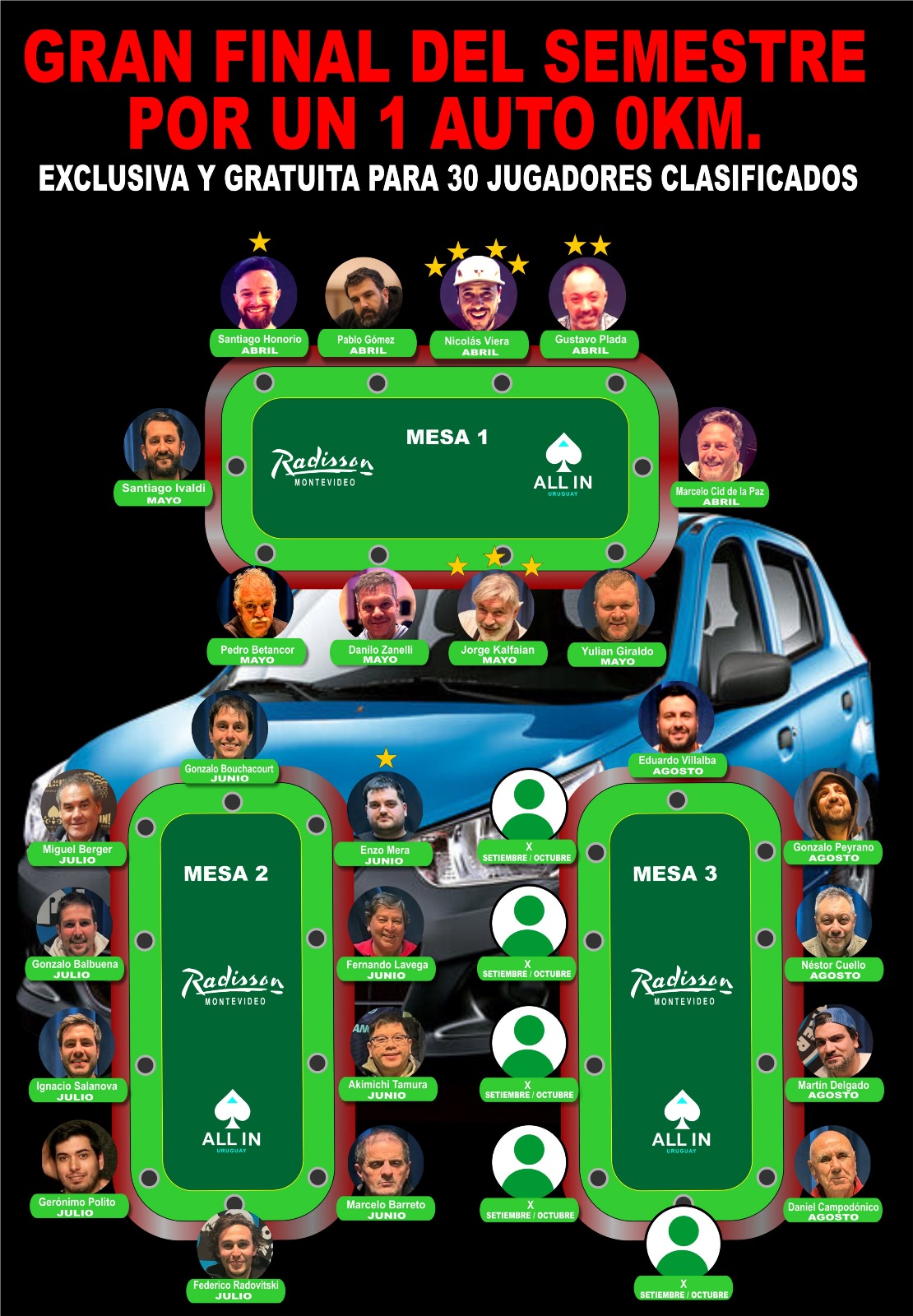 PERO ATENCIÓN: Ya que como ENZO MERA y NICOLAS VIERA ya clasificaron por meses anteriores, ellos obtendrían un stack inicial extra en la GRAN FINAL, y posibilitaría el ingreso a la GRAN FINAL a la posición 6 y 7, en este momento ocupados por JORGE KALFAIAN y GABRIEL RODRIGUEZ.