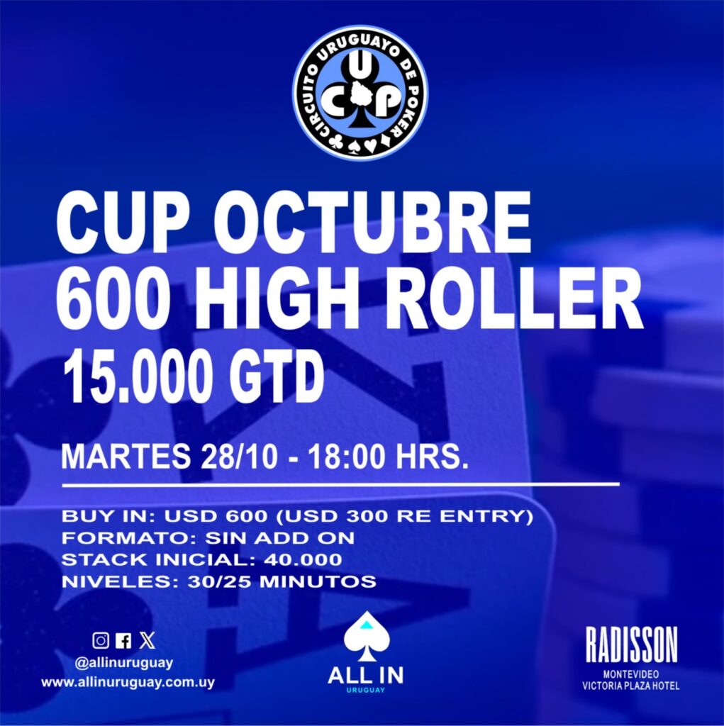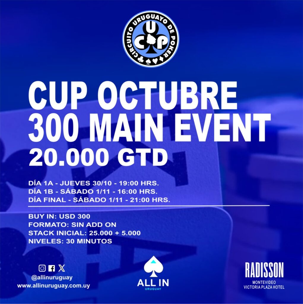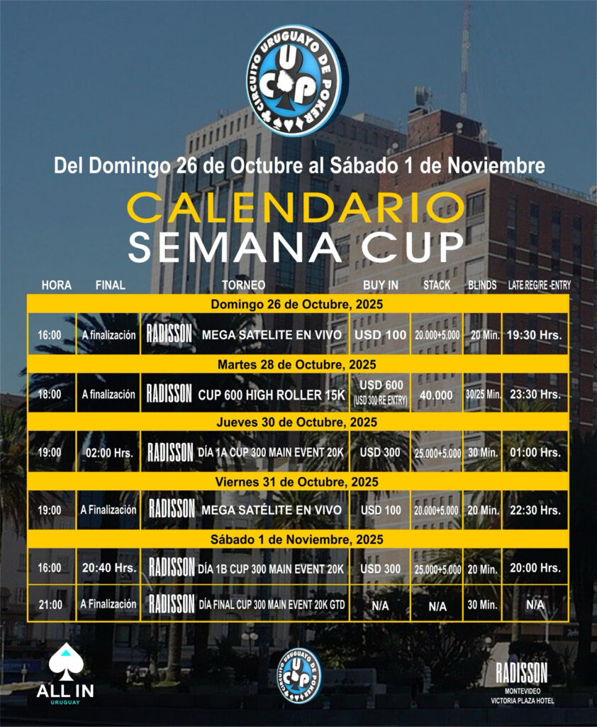 Durante los meses de Abril, Mayo, Junio, Julio, Agosto, Setiembre/Octubre se llevará a cabo el RANKING ALL IN 2025. El cual clasificara todos los meses a los 5 jugadores que hayas cosechado más puntos en todos los eventos regulares en Radisson Montevideo inclusive los eventos CUP. Estos últimos, al igual que la primera semana de cada mes, PUNTUARÁ DOBLE.