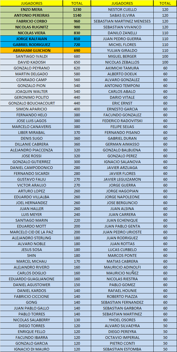 1ro- 300 pts, 2do- 260 pts, 3ro- 220 pts, 4to- 200 pts, 5to- 180 pts, 6to- 160 pts, 7mo- 140 pts, 8vo- 120 pts, 9no- 100 pts, 10mo- 80 pts.
