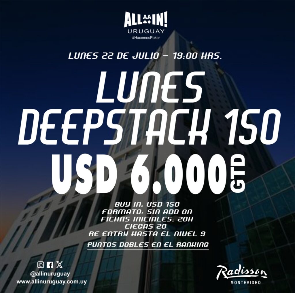 PROXIMA FECHA: ESTE LUNES 22/7 19:00 HRS SE JUEGA EL CLASICO SEMANAL DEL POKER URUGUAY: EL 150 DEEP STACK DE ALL IN URUGAY EN RADISSON MONTEVIDEO.