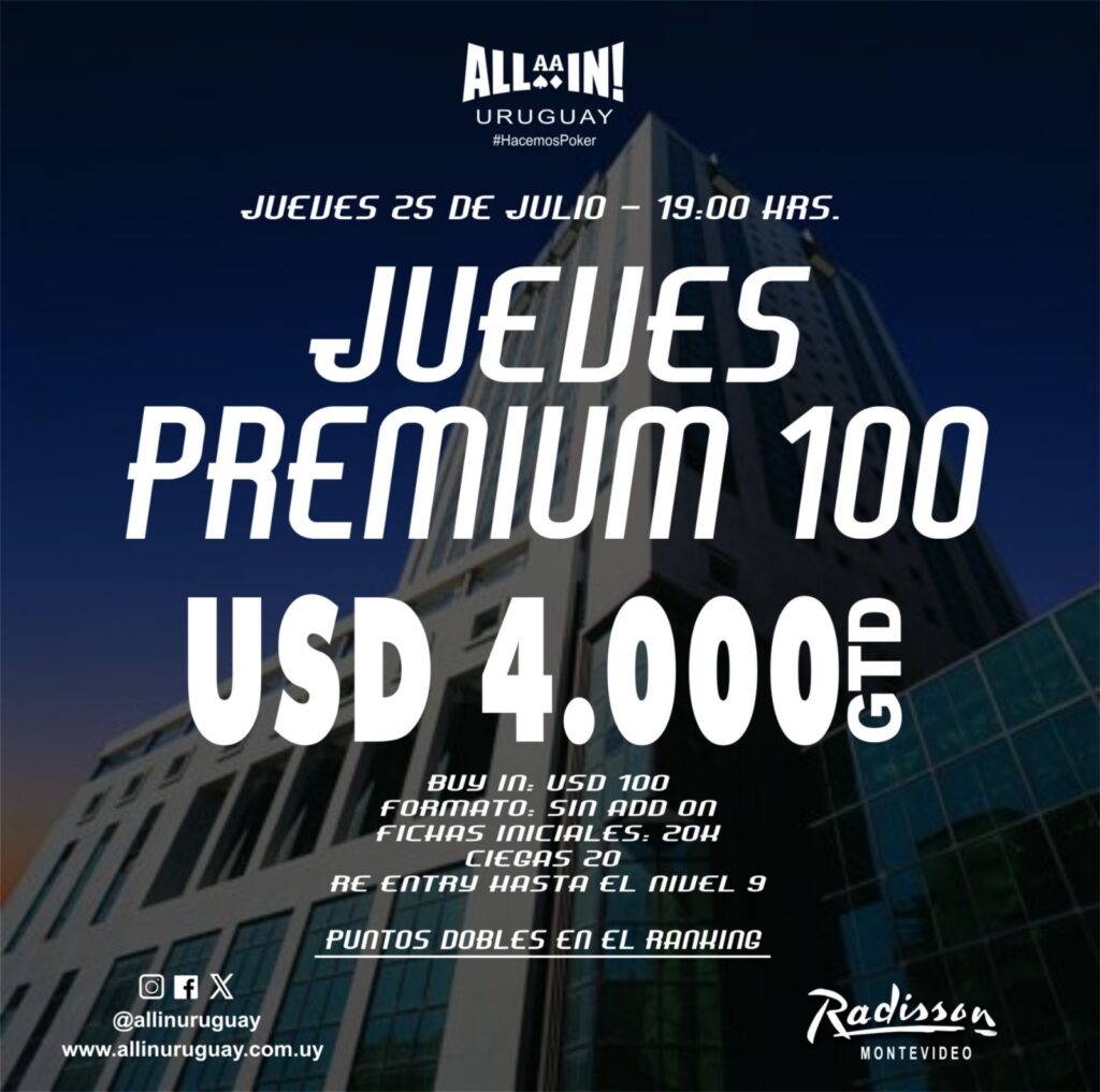 Jueves 25/7, 19:00 hrs – 100 JUEVES PREMIUM USD 4K GTD, 20.000 FICHAS INICIALES