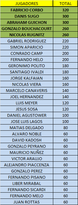 En este momento FABRICIO CORBO, DENIS SUGO, ABRAHAM GUICHON, GONZALO BOUCHACOURT, Y NICOLAS RUGNITZ, estarían siendo los 5 jugadores clasificados a la GRAN FINAL de Noviembre por un Auto 0KM.