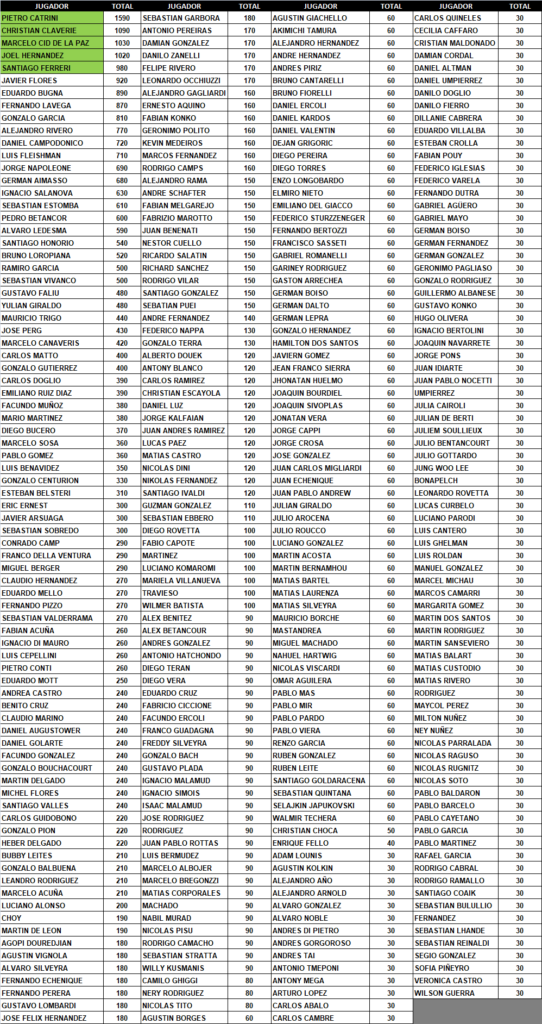 1ero: 150 pts. / 2do. 130 pts. / 3ro. 110 pts. / 4to. 100 pts. / 5to. 90 pts. / 6to. 80 pts. / 7mo. 70 pts. / 8vo. 60 pts. / 9no. 50 pts. / 10mo. 40 pts. / del puesto 11 para abajo 30 pts.