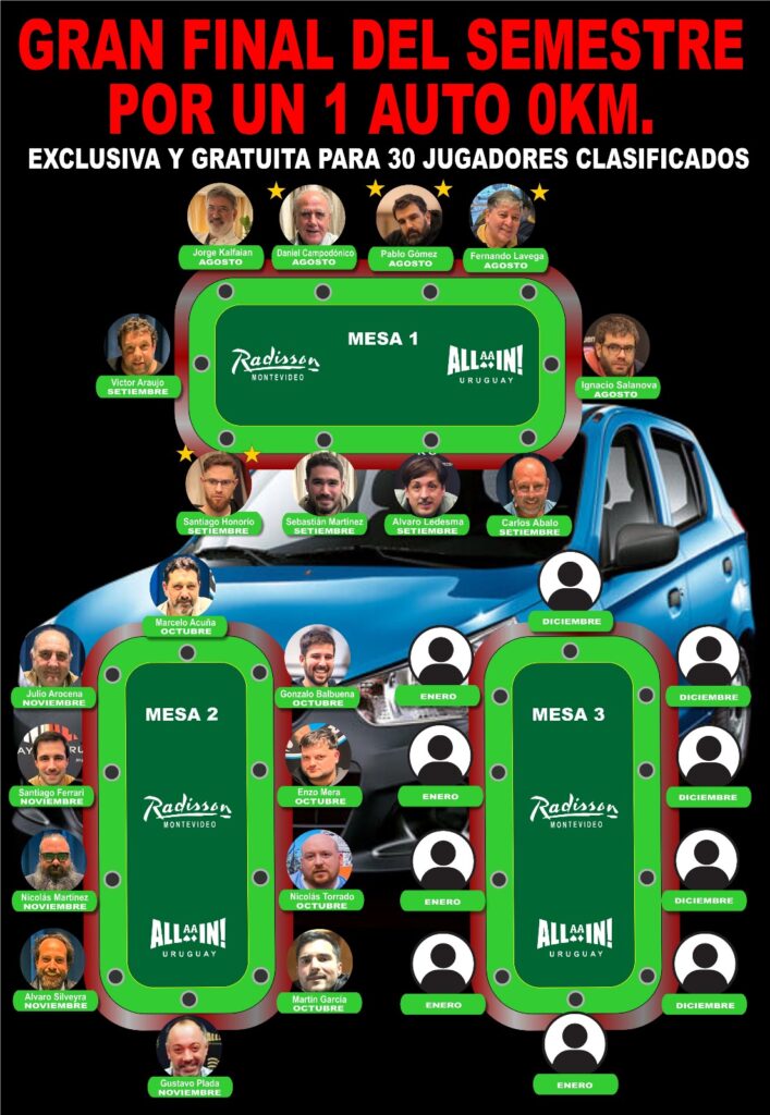 Cabe destacar que en el caso de que algún jugador repita clasificación, es decir, ingrese nuevamente dentro de los primeros 5 jugadores en un mes posterior, obtendrá 1 ESTRELLA en La Gran Final por el Auto 0KM. En el caso de que clasifique por tercera vez, obtendrá una SEGUNDA ESTRELLA en la Gran Final, y así sucesivamente. Cada estrella el jugador la podrá utilizar como desee. Podrá sumar por cada estrella un stack incial extra, o guardar alguna estrella para utilizar como Re Entry durante dicho periodo en la GRAN FINAL.