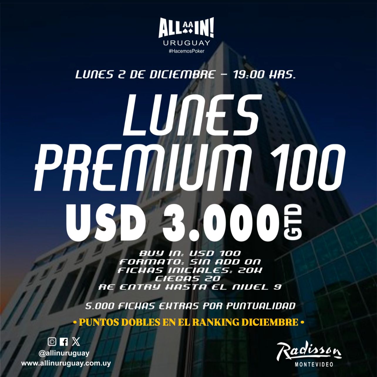 Este Lunes 19:00 hrs en Radisson Montevideo comenzamos el RANKING DICIEMBRE con PUNTOS DOBLES y un poker room que estará a pleno en el marco del LUNES PREMIUM 100, USD 3.000 GTD.
