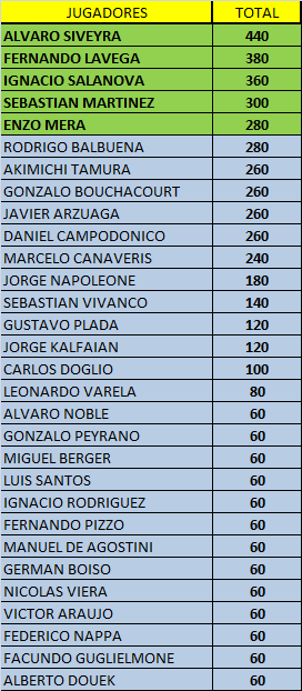 *IMPORTANTE ACLARACIÓN: Si bien Enzo Mera y Rodrigo Balbuena están igualados en puntos, tal como dice el reglamento, se tomara en cuenta la cantidad de eventos disputados. Como en ese item también están igualados, se procede a darle ventaja a aquel que haya obtenido una mejor posición o más trofeos en el periodo de referencia. La posición mas alta de Enzo fue Puesto 3 el pasado Miercoles, mientras que la mejor posición de Rodrigo fue Puesto 6 este Domingo.