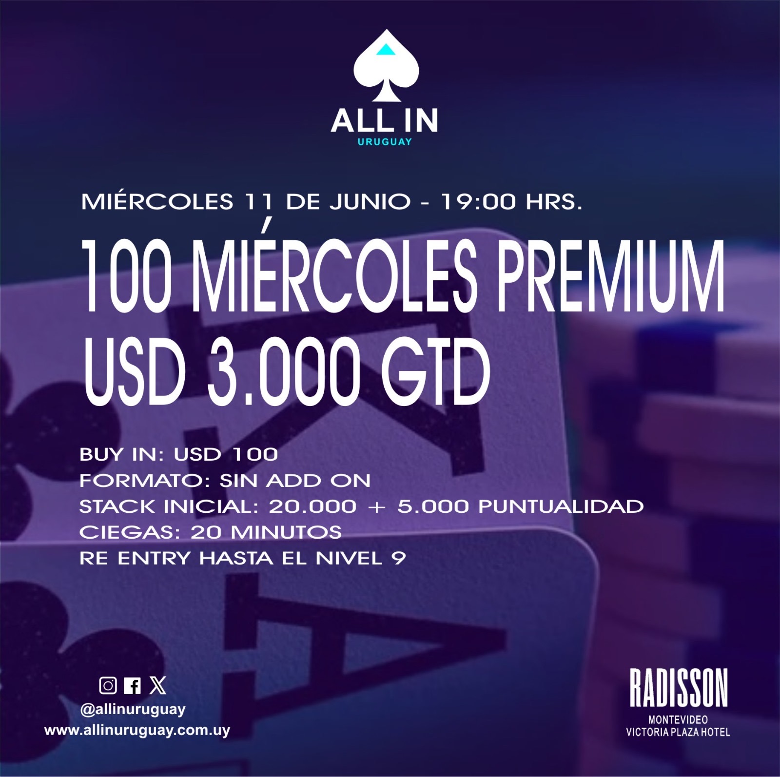 Este Miércoles 19:00 hrs en Radisson Montevideo con USD 3.000 GARANTIZADOS se juega el 100 MIERCOLES PREMIUM 3K GTD en lo que será la FECHA 3 de este nuevo camino.