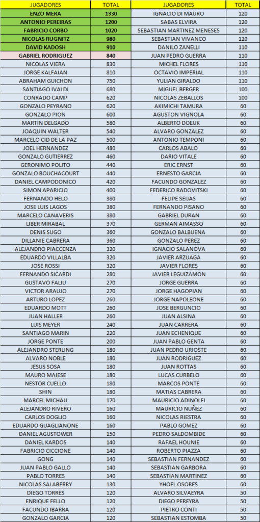 1ro- 300 pts, 2do- 260 pts, 3ro- 220 pts, 4to- 200 pts, 5to- 180 pts, 6to- 160 pts, 7mo- 140 pts, 8vo- 120 pts, 9no- 100 pts, 10mo- 80 pts.