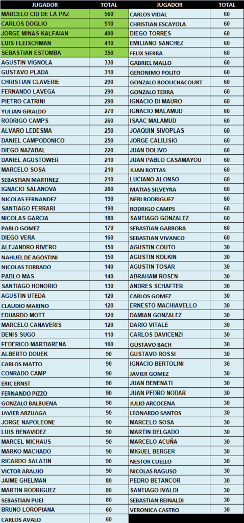 1ero: 150 pts. / 2do. 130 pts. / 3ro. 110 pts. / 4to. 100 pts. / 5to. 90 pts. / 6to. 80 pts. / 7mo. 70 pts. / 8vo. 60 pts. / 9no. 50 pts. / 10mo. 40 pts. / del puesto 11 para abajo 30 pts.
