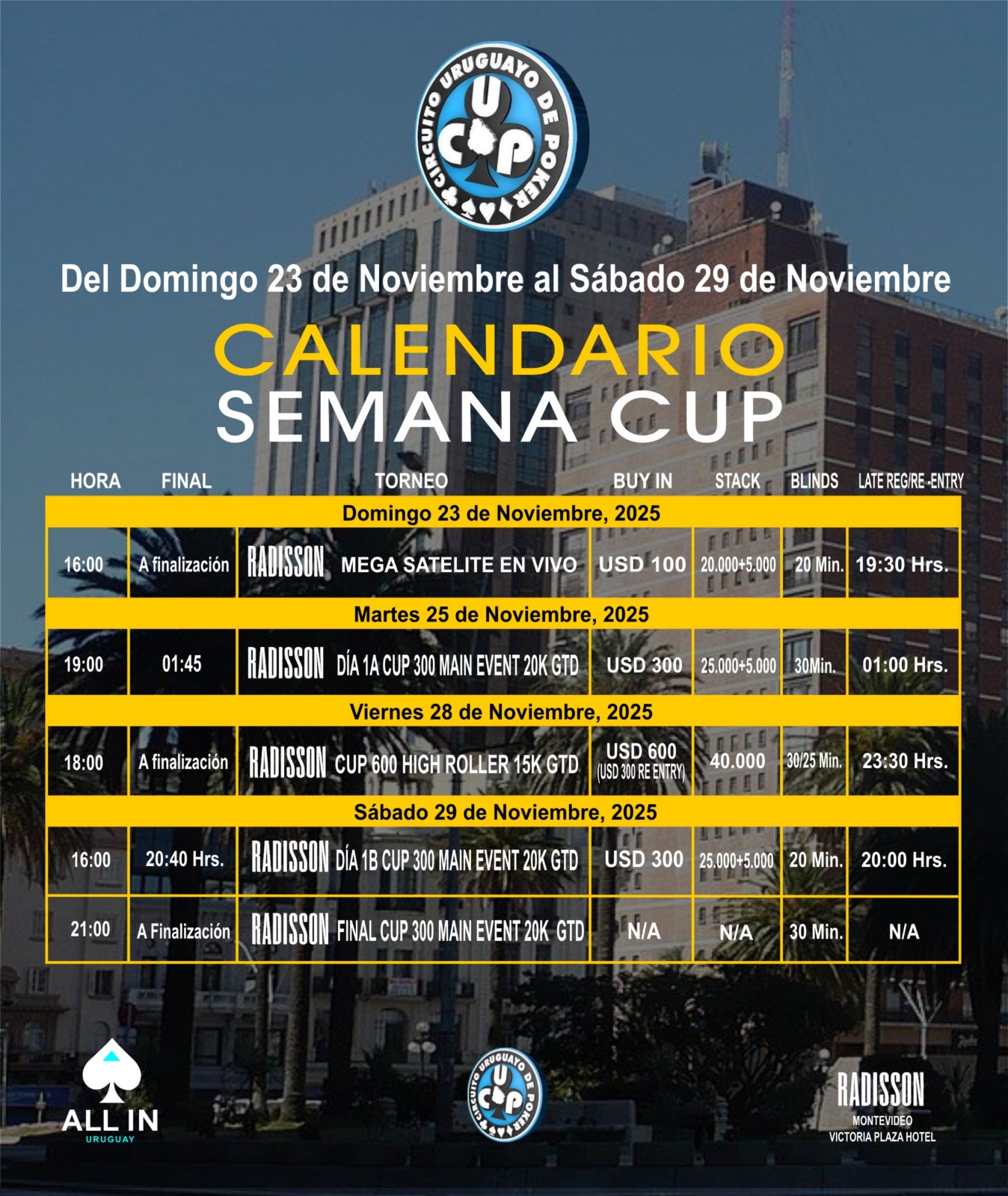 Durante los meses de NOVIEMBRE, DICIEMBRE, FEBRERO, MARZO, ABRIL, MAYO/JUNIO se llevará a cabo el RANKING ALL IN 2026. El cual clasificara todos los meses a los 5 jugadores que hayan cosechado más puntos en todos los eventos regulares en Radisson Montevideo inclusive los eventos CUP. Estos últimos, al igual que la primera semana de cada mes, PUNTUARÁ DOBLE.