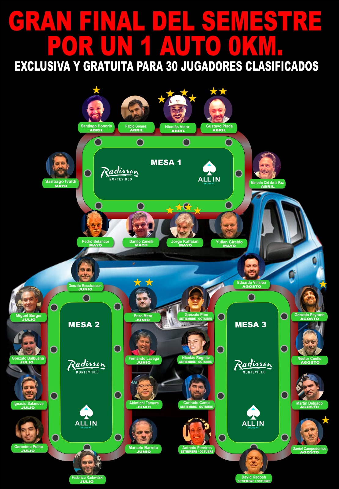 PERO ATENCIÓN: Como ENZO MERA y JORGE KALFAIAN ya clasificaron por meses anteriores, obtienen un stack inicial extra en la GRAN FINAL, y posibilitan el ingreso a las posiciones 6 y 7, ocupadas por DANIEL CAMPODONICO y NICOLAS RUGNITZ. Y a su vez, como DANIEL CAMPODONICO ya estaba clasificado por el mes de AGOSTO, el «Canario» obtiene un stack inicial extra en la GRAN FINAL, y posibilita el ingreso a 8 ocupada por GONZALO PEYRANO.